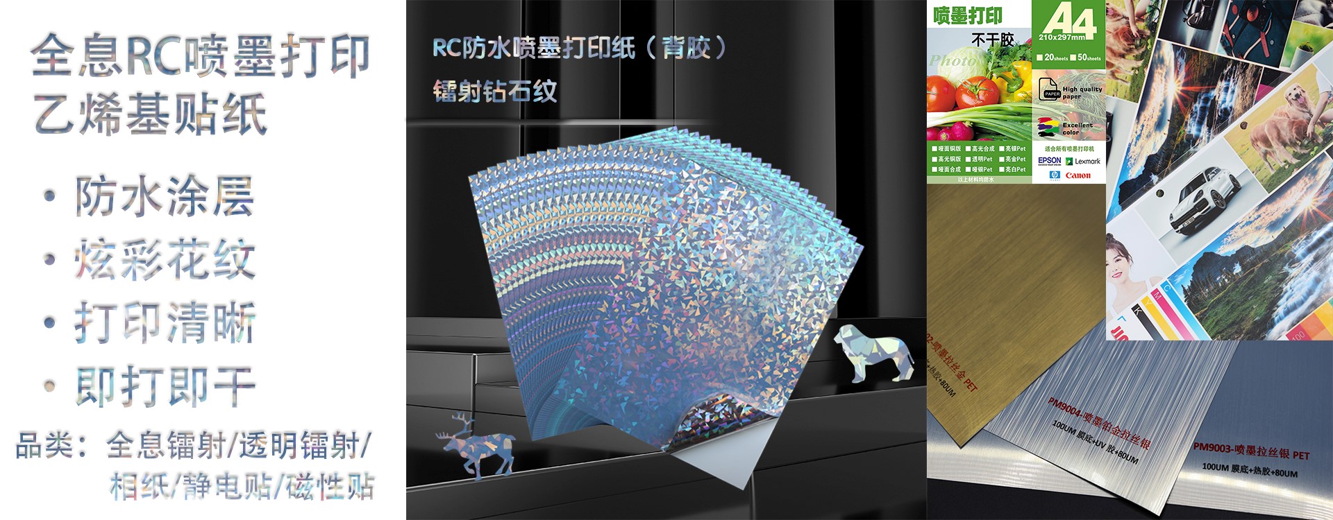 我們是一家專業(yè)生產(chǎn)噴墨可打印不干膠材料及標(biāo)簽的公司,集材料涂層、涂膠、分切、模切、切張、包裝等。卷料、標(biāo)簽、平張(A4、A3、美標(biāo))均可定制,現(xiàn)有產(chǎn)品包括噴墨合成紙系列、噴墨鐳射系列、噴墨透明鐳射系列、以及可用于高速彩噴打印的噴墨高光銅版紙等。